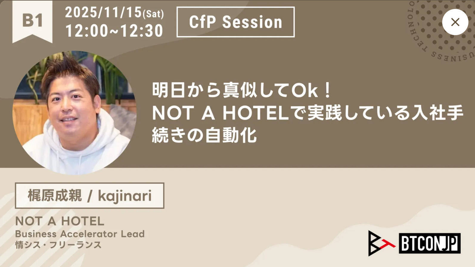 BTCONJP 2025 で「明日から真似してOk!NOT A HOTELで実践している入社手続きの自動化」についてお話ししました。多くの方にご参加いただき、熱量の高い場になりました。現場でそのまま活かせる示唆を持ち帰っていただければ嬉しいです。